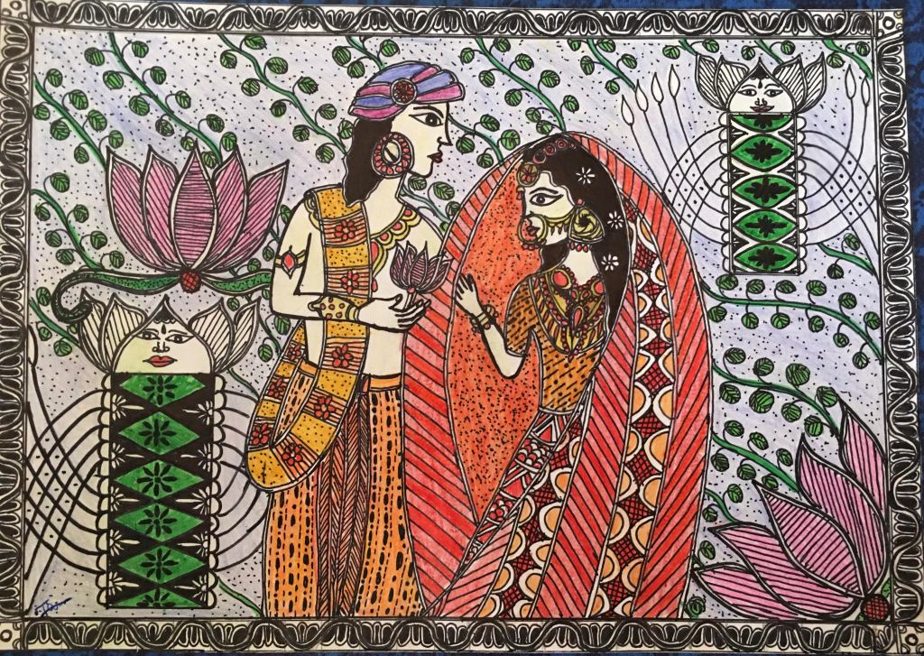 This is another drawing form the madubani style…the main symbols used in the drawing are the lotus and sugarcane in the background. Lotus motif symbolizes feminity while the Sugacane motif symbolizes a sense of mascular being. These two symbols are used widely as wall patterns especially on the walls of the house where newlyweds live. The best part of this composition is the use of the masculine and feminine figures that go along with the motifs in the background which creates mood of the composition!