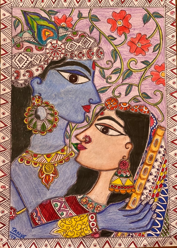 This is another Madhubani drawing of the extremely well known Lord Krishna and Radha his dearly loved one. The idea and the main outline of the drawing was taken from soma@folkart, yet I have made changes like the colour scheme, filling, etc.The best part of this composition is the beautiful way Lord Krishna and Radha have been depicted, the artistic way in which the feeling of the composition reaches the observer!!!