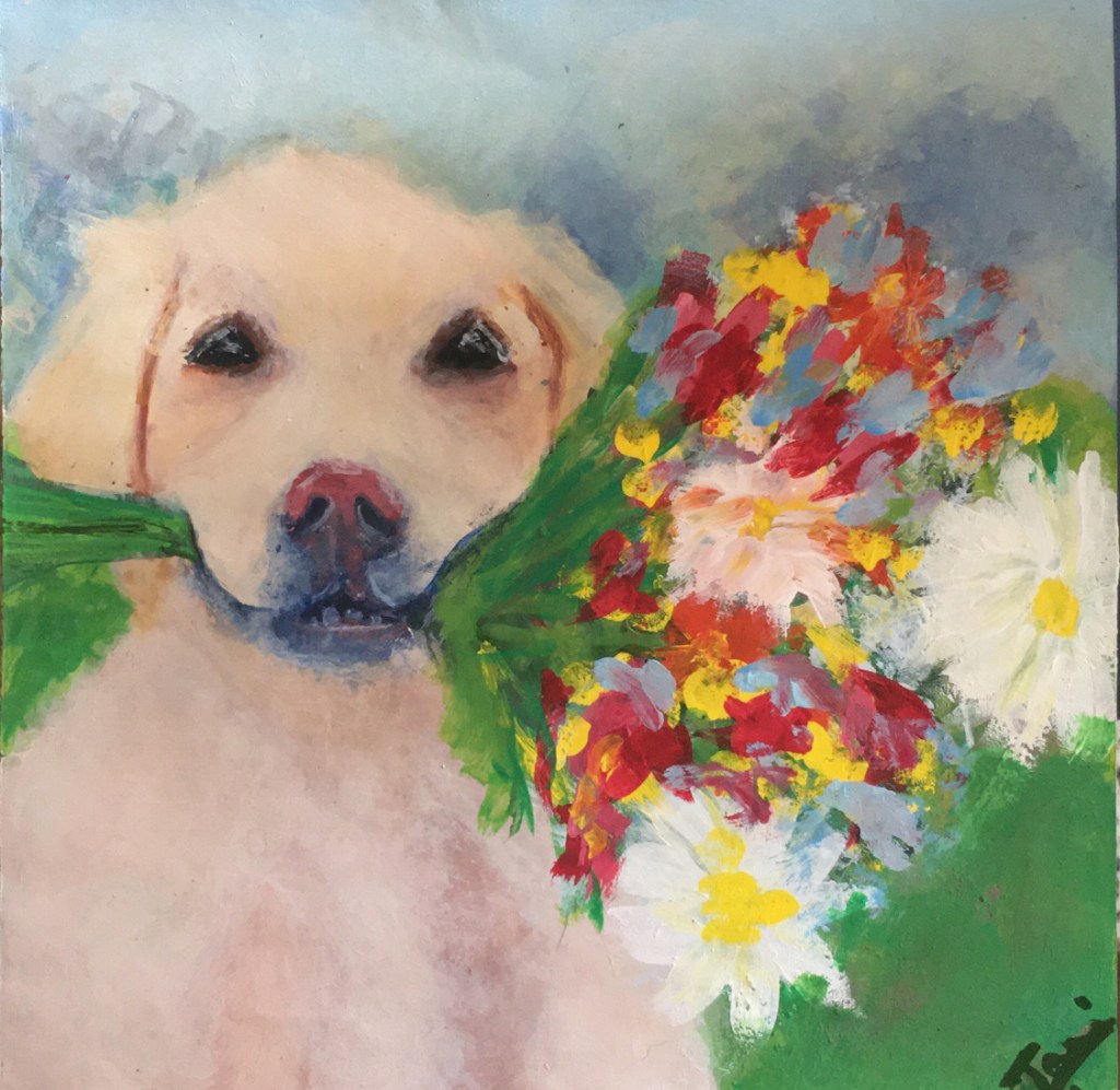 This is another painting from THEARTSHERPA on Youtube. It is a awesome painting of a golden-retriever with a mouthful of colorful flowers. There isn’t much to say except that the best part of this painting is the expression in the eyes of the golden-retriever along with it’s fur and the colorful flowers going well with each other to create this beautiful composition!!!