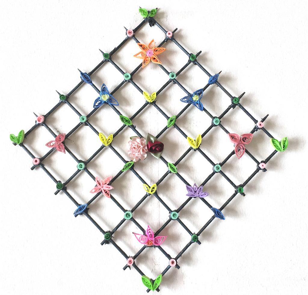 - Take the paper quilling strips and quill beautiful little flowers of your color choice and leaves enough to cover all of the intersections. If easily available at home, use any paper flower or plastic flower of bright colors and glue it to the center intersection of the grid.