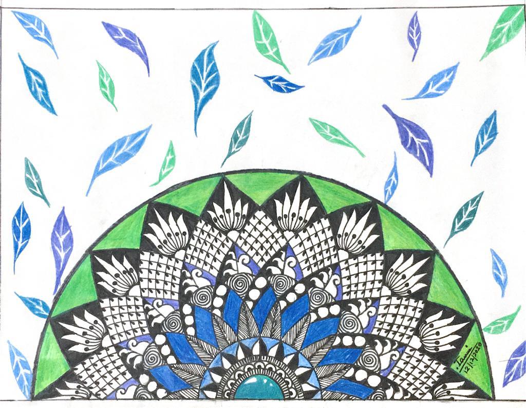 This is another mandala drawing. The main idea was taken from a Facebook group related to art, to which I have made little modifications. There isn’t much to say about this creative mandala – it’s looks speak for itself! The best part of this composition is the combination of the designs in each row of the mandala setting off beautifully with the cool shades of blue and green!!!