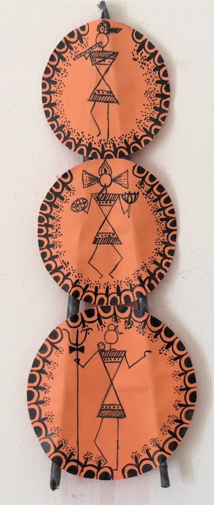This style of drawing is known as Warli Painting which originated in the tribal people from the North Sahyadri Range in Maharashtra, India and is still practiced. These paintings usually depict scenes of human figures engaged in activities like hunting, dancing, sowing and harvesting. In this wall hanging, the three gods – Lord Shiva, Lord Ganesh and Lord Krishna have been depicted in this style of tribal art.