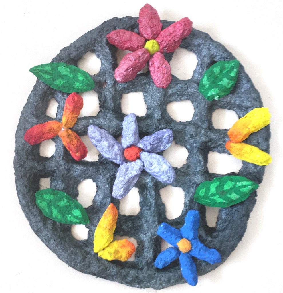 In this craft I have molded the recycled paper mash into a circle with a crisscross pattern and also molded the remaining paper mash into flower shape and leaf shapes. After these items have dried completely, I painted the crisscross patterned circle with Acrylic Pearl Black/Metallic Black Pidilite Paint and the flowers and leaves with bright Pidilite Acrylic Paints and left them for about a whole day to dry. Once the paint dried I glued the flowers and leaves in a random arrangement according to my choice. The colors and size depends upon your need and your wall background where you want to place the wall hanging!!!