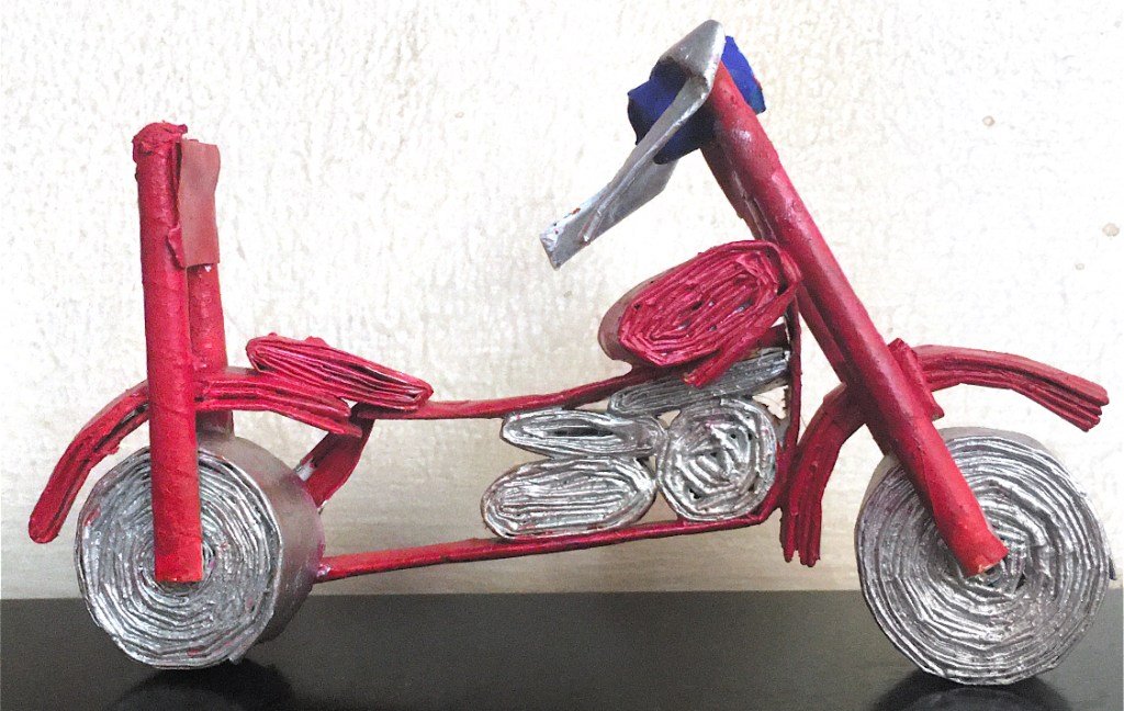 This is an old-fashioned motorbike made from old newspaper rolls, paint and glue. It is very simple to make with all you have to do is roll strips of the old newspaper in different shapes for different parts( I suggest taking wide strips especially for the tires of the motorbike so it will be able to stand upright) of the motorbike (as shown in the above image) and glue them together as different parts of the motorbike. Lastly, once the glue has dried, paint the motorbike with acrylic paint (I suggest using Pidilite or Camlin paints) of your choice. The best part of this craft is that it is easy to make, doesn’t take much time and looks quite good to keep as home décor item/ showpiece.
