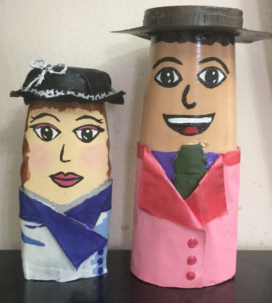 These are two empty shampoo bottles which have been given a makeover as a best out of waste items. Materials required are – acrylic paints (Pidilite), glue, craft paper/ pieces of cloth, old plastic jar lids and decorative material (optional).
