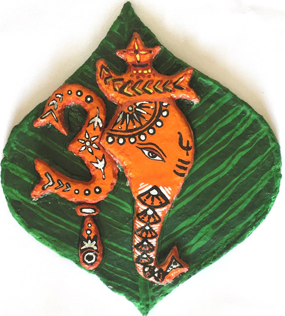 - Once both the objects have dried, you can make a paste of white cement and apply a layer of it on the surface if it of the objects isn’t smooth enough OR you can paint the leaf and Lord Ganesha’s side facing head shape (you can paint your own color combination according to your choice) using acrylic paints as shown in the above image. Leave it to dry.