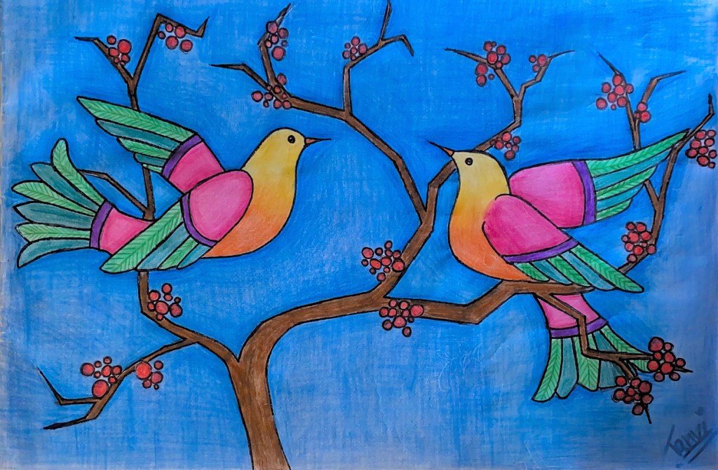 > tanvi posted: ” This is a beautiful composition of two birds and a tree > full of berries in a kind of abstract-design setting. The idea has been > taken from the book ‘Grade Examinations – Drawing Made Easy’ by Navneet. > The best part of this drawing is the colouring of” >