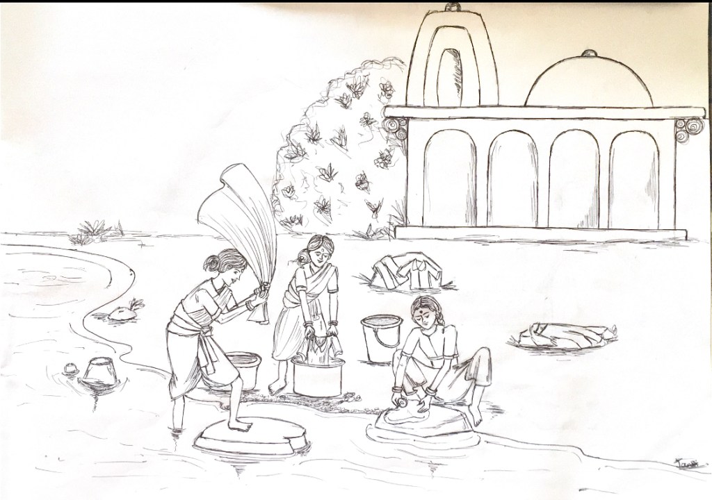 This is a simple sketch of a common scene seen in India at riverbanks; women washing clothes. I have taken the idea from the book : Grade Examinations – Drawing Made Easy by Navneet. Well, best part is the way the image has been adapted as a drawing!!!