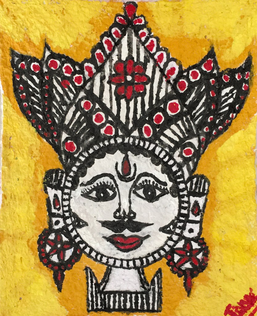 This another beautiful Madhubani styled painting done on recycled notebook paper. Painted with acrylics, this is a painting of the Sun God or Lord Surya in the tribal art of Madhubani. Traditionally, there aren’t many colors usually used in Madhubani paintings since the tribals used made from vegetables, fruits and other natural plant dyes. Thus, in this painting, I have painted Lord Surya using only white and red paint along with black for outline whereas, the background in chrome yellow with streaks of yellow ochre. The best part about this painting is the combination of all colors giving the intended effect!!!